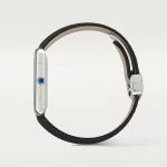 Tank Must watch, extra-large model, Manufacture mechanical movement with automatic winding, caliber 1847 MC. Steel case, beaded crown set with a synthetic cabochon-shaped spinel, silvered flinqué dial, blued-steel sword-shaped hands, interchangeable black grained calfskin strap, interchangeable steel deployant buckle, calendar aperture at 6 o’clock. Case dimensions: 41 mm x 31 mm, thickness: 8.4 mm. Water-resistant up to 3 bar (approx. 30 meters/100 feet).