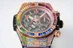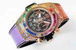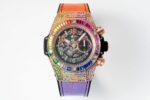 【 Reservation Required 】 Two new rainbow watches from the ZF Masterpiece HUBLOT BIG BANG Unico Rainbow Watch Big Bang series feature colorful gemstones embedded in the watch, with multiple color gradients presenting a dreamlike and dazzling effect. The position, quantity, and size of each gemstone are matched with the customized Hengbao exclusive UNICO HUB 1280 automatic flying back counter timing core with a 3-character hollow calendar ring and a 3-character dial for 60 minutes (note: the 7750 movement on the market can only time 30 minutes). The 8-character horizontal clutch 9-character small second wheel sapphire crystal mirror has an impeccable texture of 45mm, and all functions are 100% perfect to achieve ceiling level. Welcome players to taste (ZF’s must be a boutique) The sentence is: