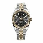 This White Gold Sky-Dweller Jubilee Replica is a Rolex watch with a 9001 Automatic movement and a power reserve of 60 hours. It has a 904L stainless steel case with a white gold bezel and a sapphire crystal. The bracelet is also made of 904L stainless steel and is adjustable for all sizes. The black dial has stick indices and stick hands made of 904L stainless steel. The watch has a variety of functions. including hours. minutes. seconds. an additional 24 hour hand. date. annual calendar. month. and chronometer. It has passed the 30m water resistance test and is protected by a full 2 year international warranty.